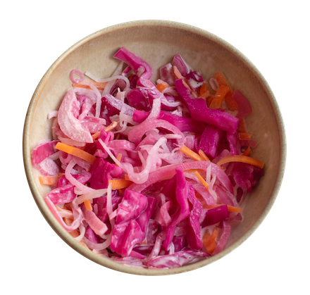 Sushi rice, teriyaki chicken, sweet potato, cucumber, pickled egg and pickled red onion